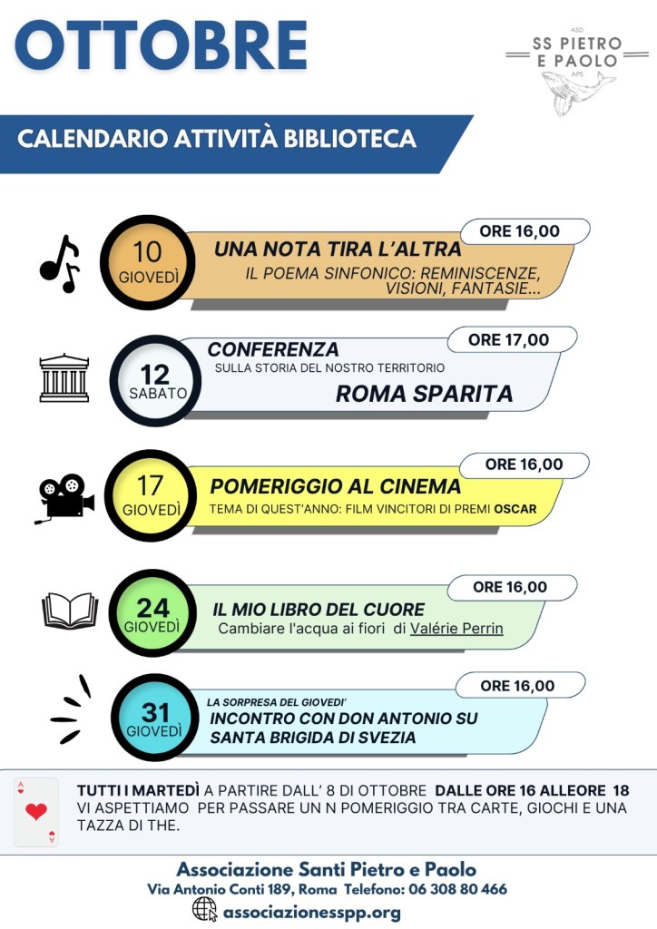 Ogni settimana il giovedì la biblioteca propone un appuntamento culturale dedicato al cinema, alla lettura e alla musica. Per gli appassionati di storia, invece, presentiamo un ciclo di incontri dedicati alla storia romana e le passeggiate dedicate alla scoperta del nostro territorio.